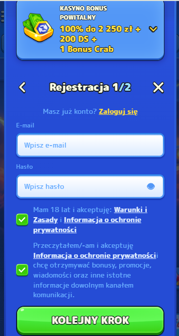 Wpisz e-mail oraz hasło, potwierdź pełnoletniość (18+) i akceptację Regulaminu oraz Polityki prywatności. - Uzupełnij profil.